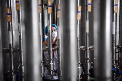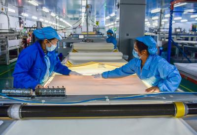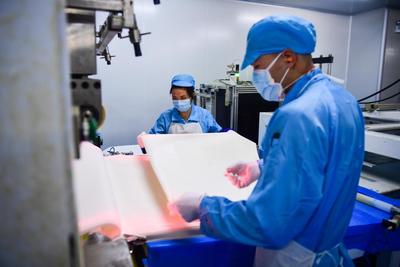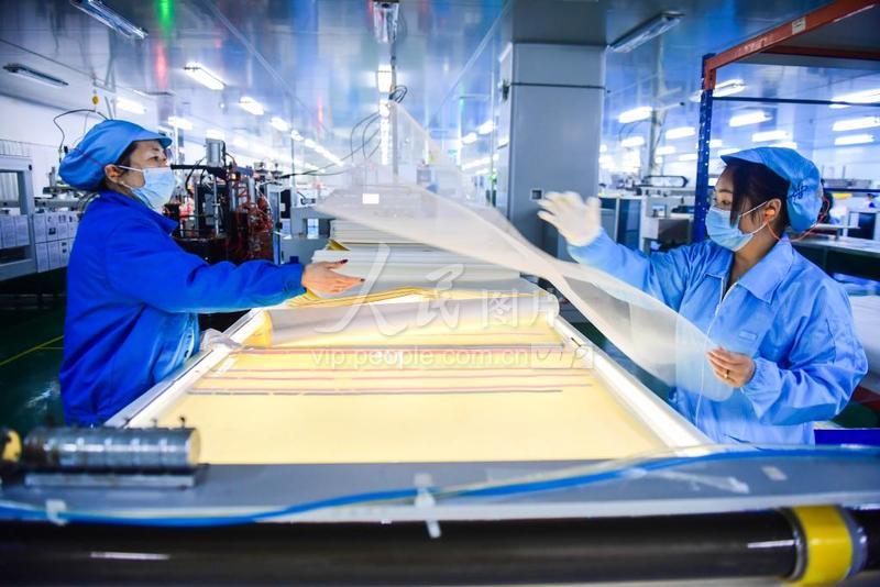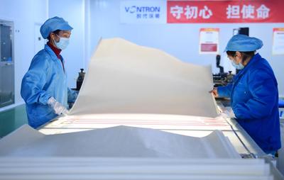 上传时间: 2020-02-10 17:41:18 图片说明: 2月10日,贵州省贵阳市国家高新区,时代沃顿科技有限公司生产车间工人在制膜元件。