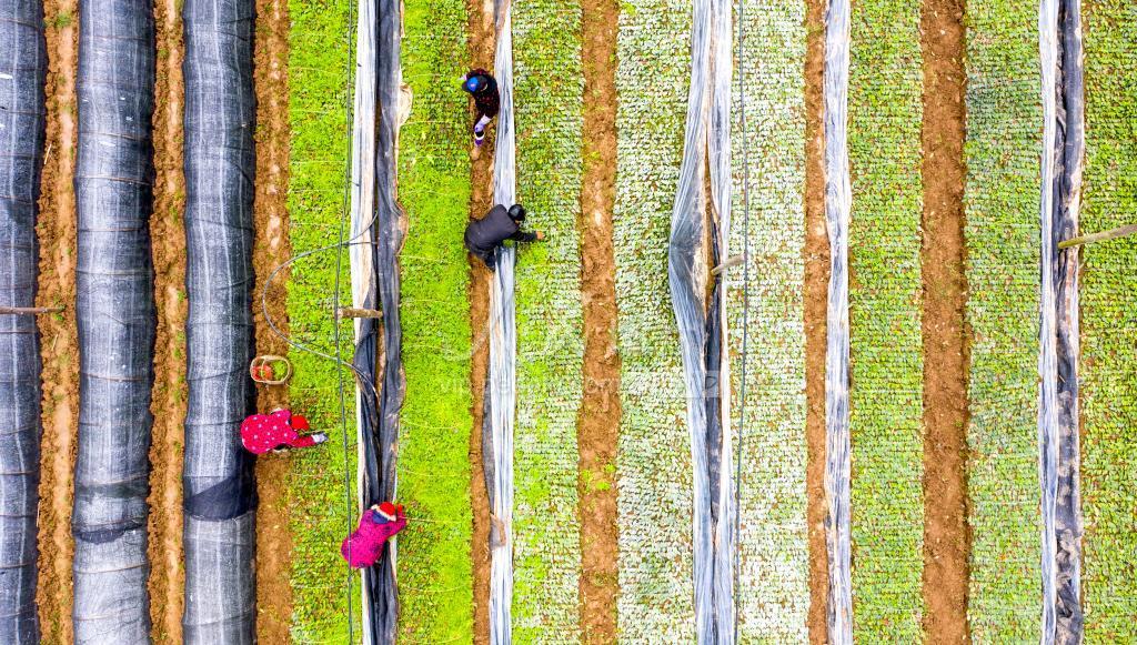 2020年2月12日,安徽省合肥市庐江县柯坦镇分水村的茶叶育苗基地,茶农们正在给茶苗除草、间苗。随着春耕序幕拉开,庐江县田间地头一片忙碌。农民们一手抓疫情防控、一手抓春耕生产。茶农们趁着天气回暖的有利时机,给新培育的茶苗做移栽前的最后管理。