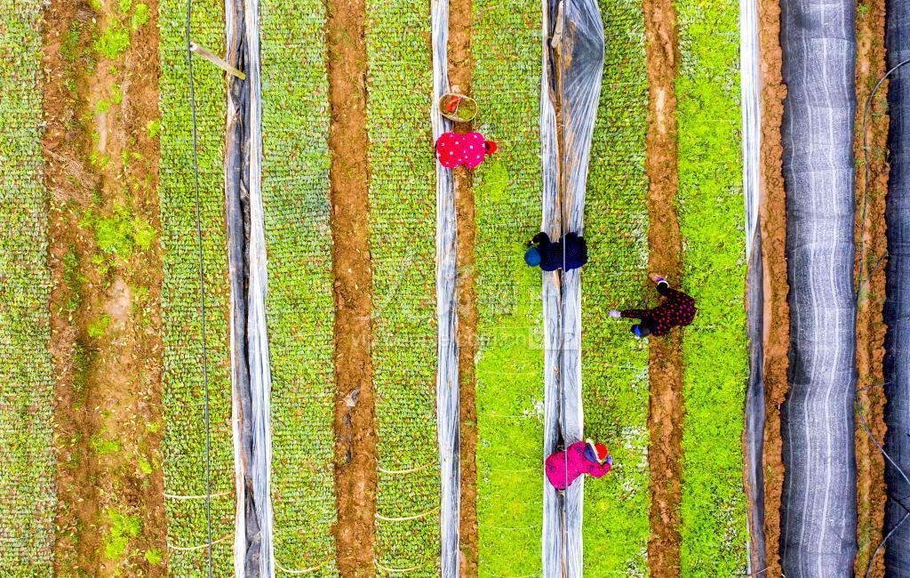 2020年2月12日,安徽省合肥市庐江县柯坦镇分水村的茶叶育苗基地,茶农们正在给茶苗除草、间苗。随着春耕序幕拉开,庐江县田间地头一片忙碌。农民们一手抓疫情防控、一手抓春耕生产。茶农们趁着天气回暖的有利时机,给新培育的茶苗做移栽前的最后管理。