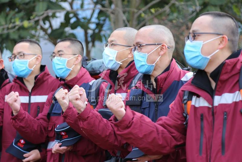 2020年2月12日,云南省对口支援湖北省咸宁市医疗队队员在出发前加油鼓劲。