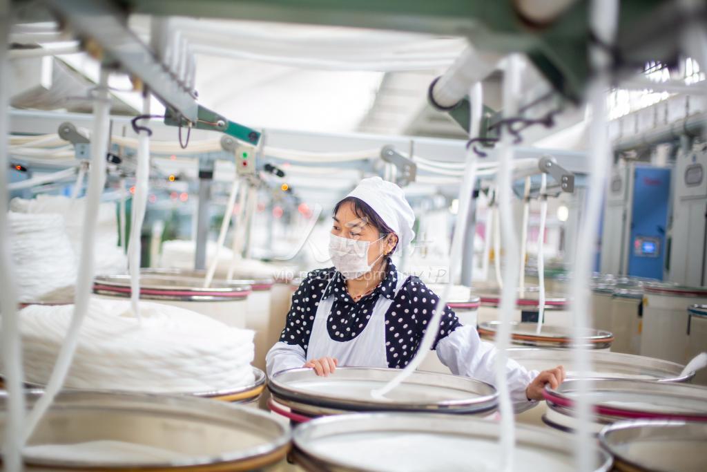 2020年2月14日,江苏省海安市曲塘镇双弘纺织有限公司生产车间内,纺织工人正在自动生产线上操作。 连日来,海安市一手抓好疫情防控,一手推进复工复产,及时协调解决企业复工复产中的困难和问题,积极推动企业有序复工复产,保障经济平稳运行。