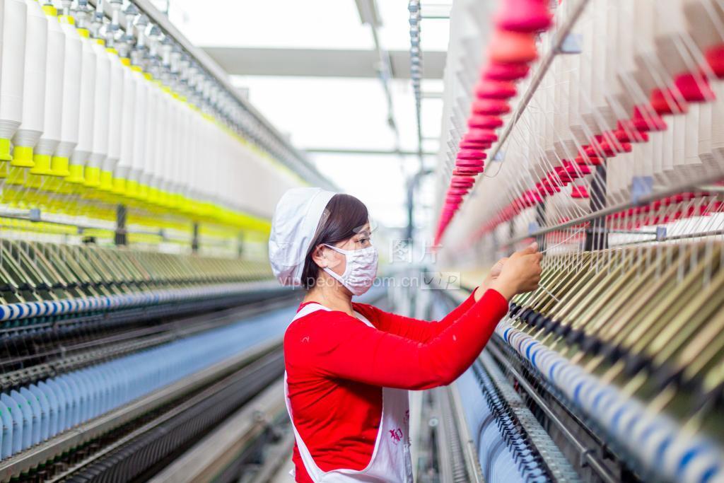 2020年2月14日,江苏省海安市曲塘镇双弘纺织有限公司生产车间内,纺织工人正在自动生产线上操作。 连日来,海安市一手抓好疫情防控,一手推进复工复产,及时协调解决企业复工复产中的困难和问题,积极推动企业有序复工复产,保障经济平稳运行。