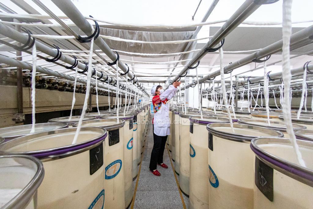 2020年2月14日,江苏省海安市曲塘镇双弘纺织有限公司生产车间内,纺织工人正在自动生产线上操作。 连日来,海安市一手抓好疫情防控,一手推进复工复产,及时协调解决企业复工复产中的困难和问题,积极推动企业有序复工复产,保障经济平稳运行。