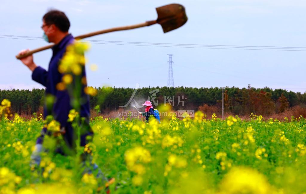 2020年2月14日,在江西省吉安市泰和县沿溪镇仓岭村,农民在给油菜喷施硼肥,做好春季油菜田间管理。