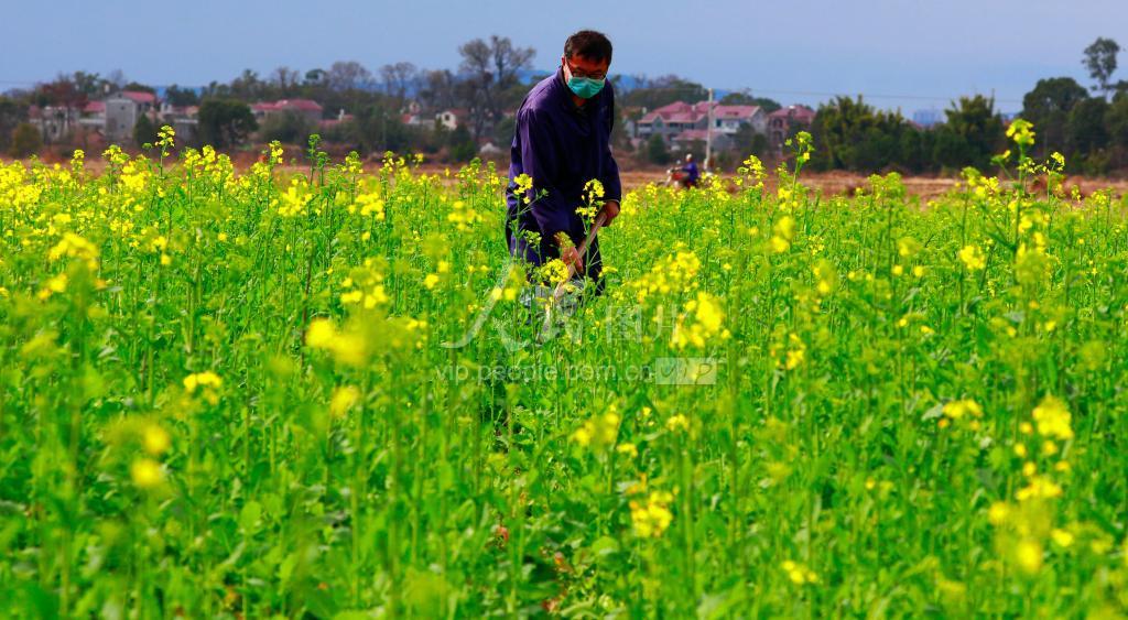 2020年2月14日,在江西省吉安市泰和县沿溪镇仓岭村,农民在油菜田里清沟排水,做好春季油菜田间管理。