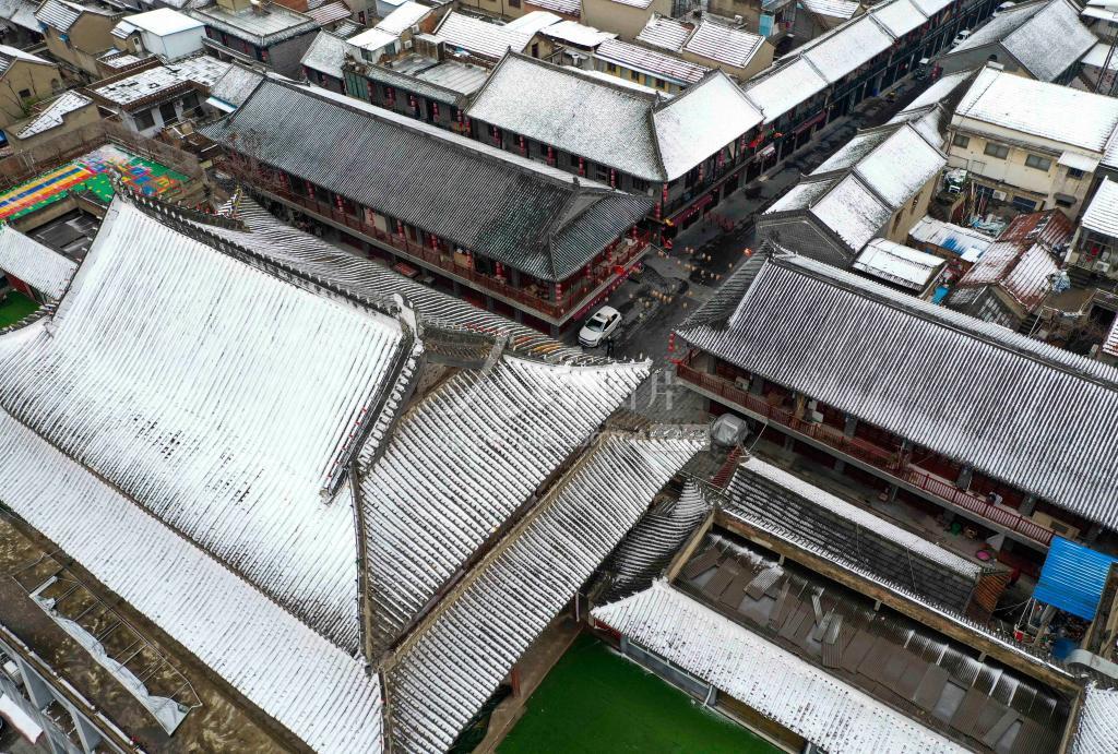 2020年2月15日,在安徽省亳州市花戏楼景区拍摄的雪景。当日,受冷空气影响,安徽省亳州市迎来降雪天气,雪后的古城亳州景色如画。