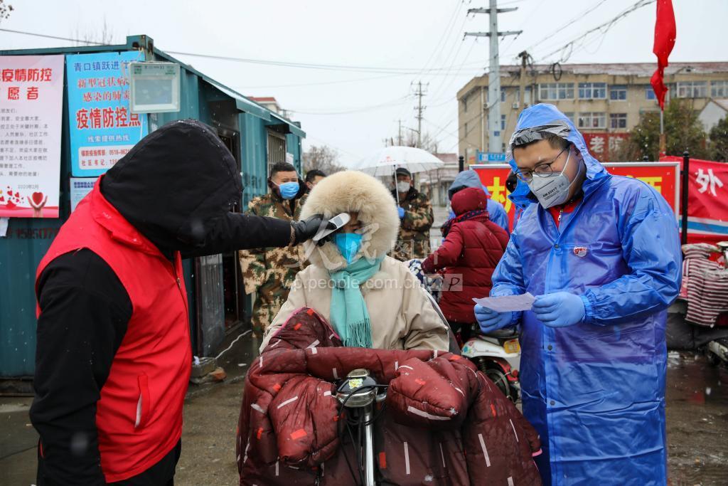 2020年2月15日,江苏省连云港市赣榆区青口镇跃进社区的工作人员在风雪中坚守岗位,为进出社区的人员进行登记及健康监测,确保疫情期间人员出入可防可控。