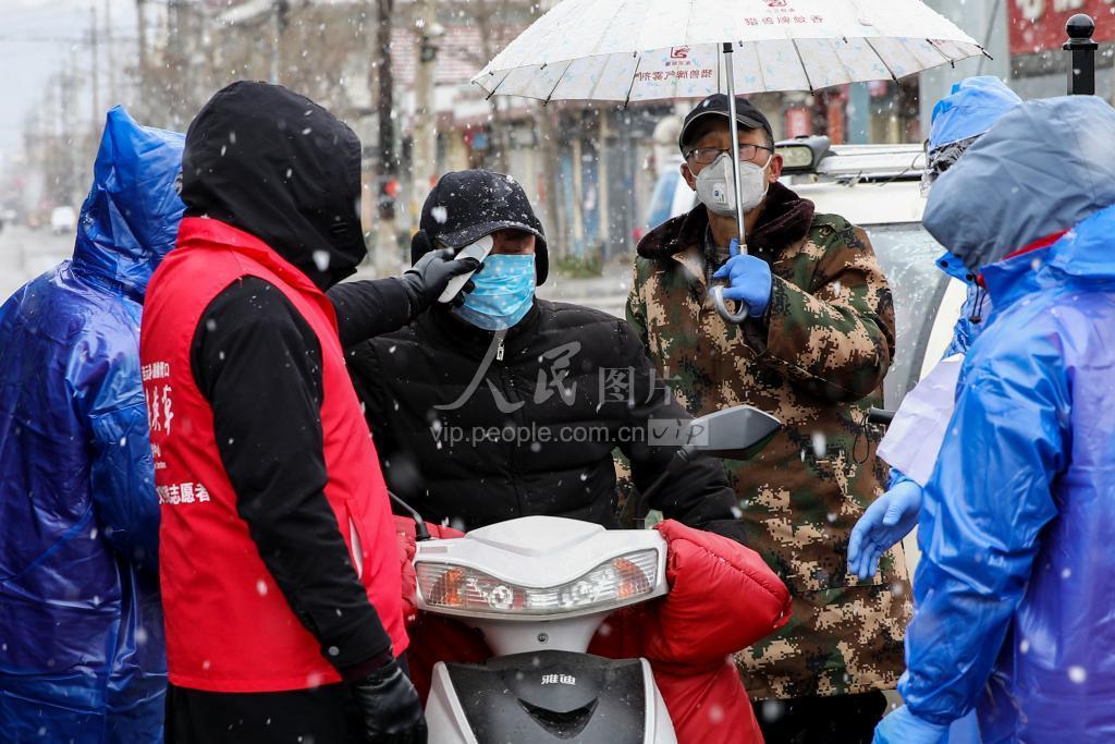 2020年2月15日,江苏省连云港市赣榆区青口镇跃进社区的工作人员在风雪中坚守岗位,为进出社区的人员进行登记及健康监测,确保疫情期间人员出入可防可控。