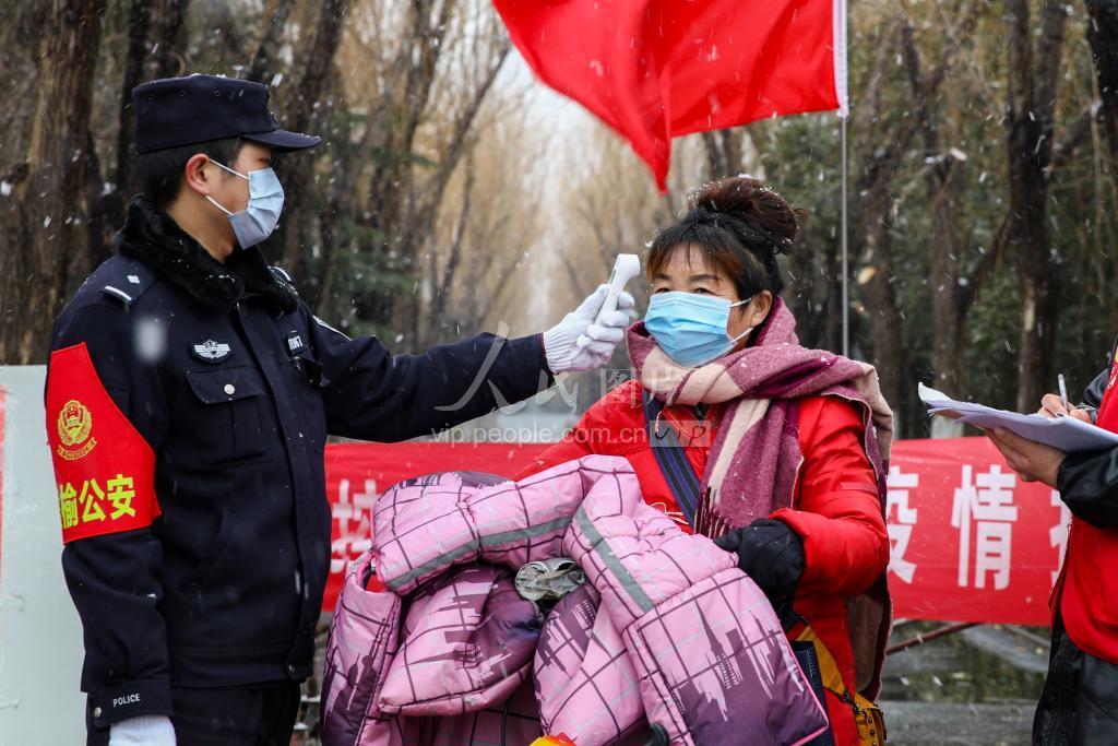 2020年2月15日,江苏省连云港市赣榆区青口镇跃进社区的工作人员在风雪中坚守岗位,为进出社区的人员进行登记及健康监测,确保疫情期间人员出入可防可控。