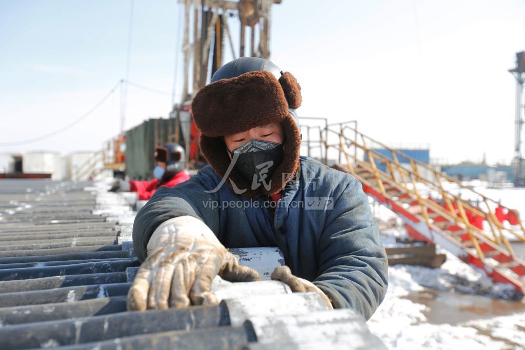 2020年2月15日,在河北唐山中石油冀东油田南堡1号人工岛作业井,修井员工正在检查油管丝扣。