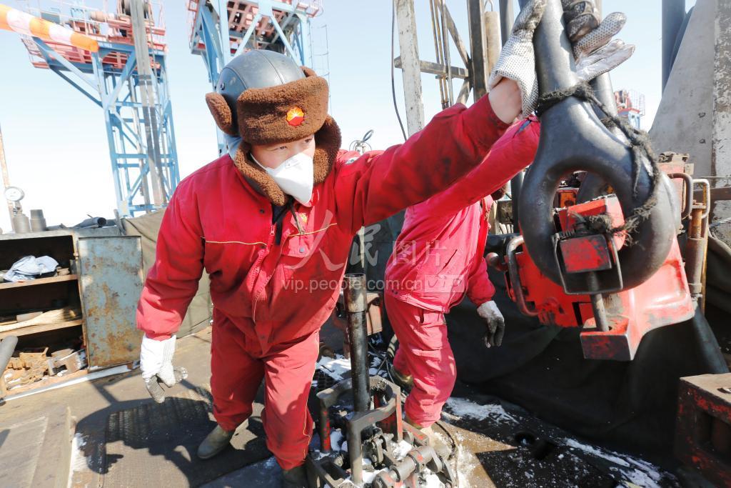 2020年2月15日,在河北唐山中石油冀东油田南堡1号人工岛,冀东油田井下作业公司修井员工正在进行大修作业施工。