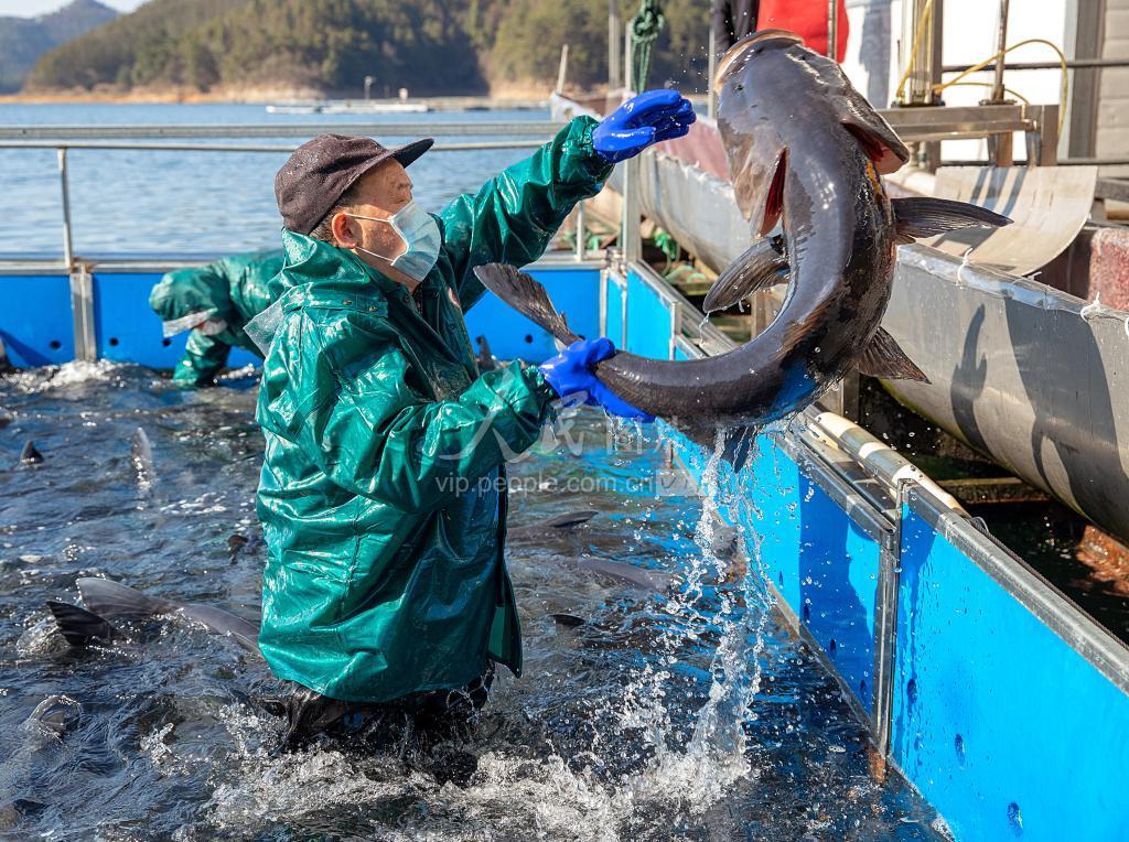 2020年2月17日,浙江省杭州市淳安县千岛湖淳鱼销售中心码头,工人正在将活鱼装车,准备配送到福州。