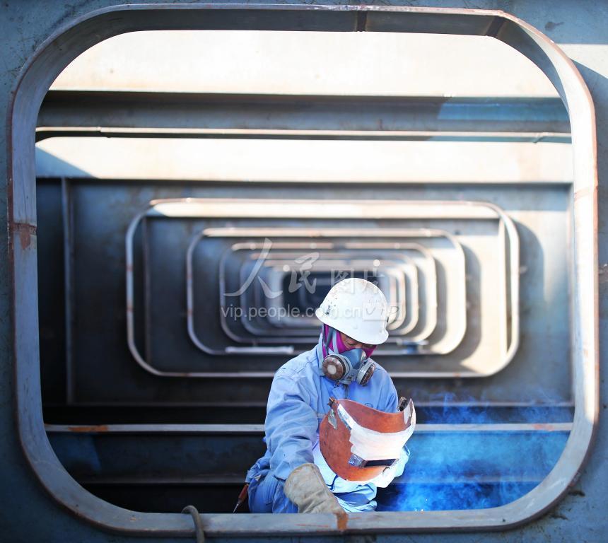 2020年2月20日,工人在位于江西省赣州市章江南大道的南河大桥拓宽改造项目现场施工