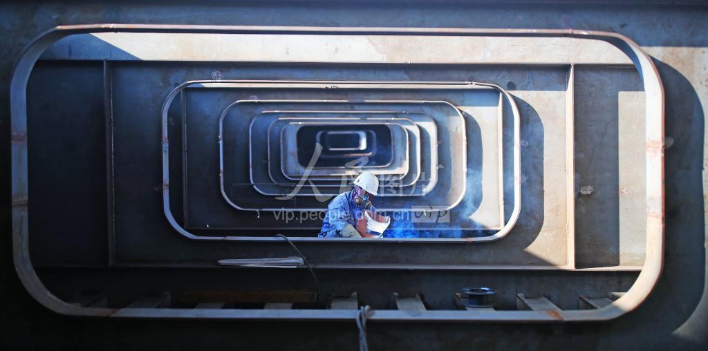 2020年2月20日,工人在位于江西省赣州市章江南大道的南河大桥拓宽改造项目现场施工。