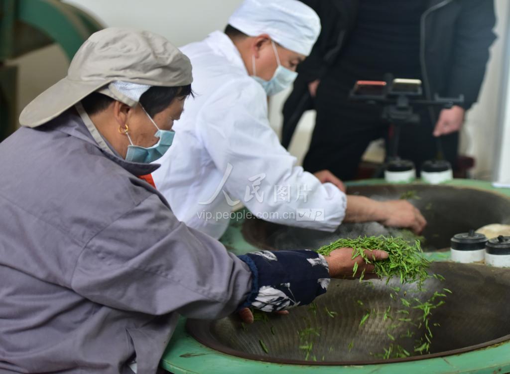 2020年2月23日,浙江武义汤记茶业公司员工边忙着手工炒制新茶,边现场直播售卖。