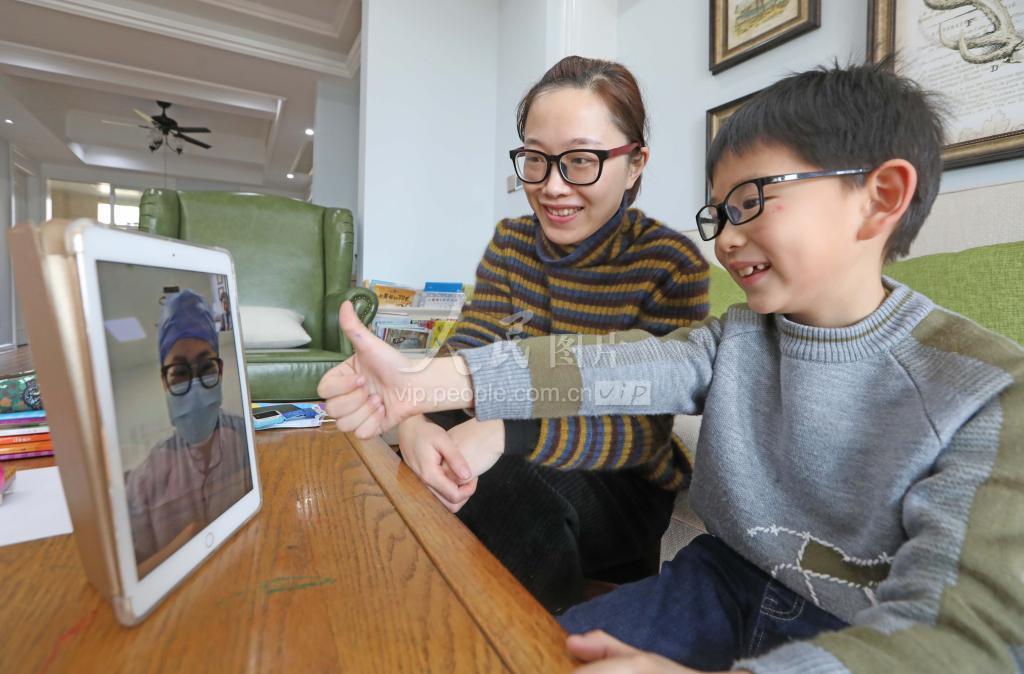 2月24日,李卓时(右一)通过视频连接给妈妈送去一个大大的赞。