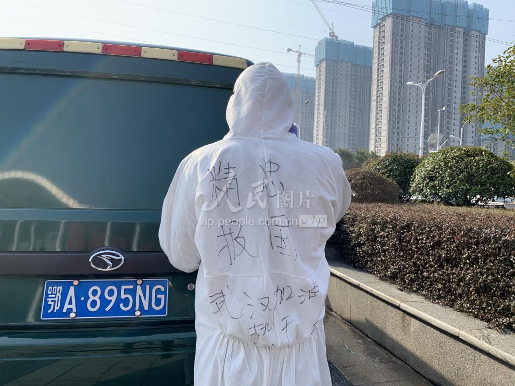 2月22日,武汉客厅方舱医院门口,一辆运输物资的邮政驾驶员防护服上写着“精忠报国”“武汉加油”等字样。
