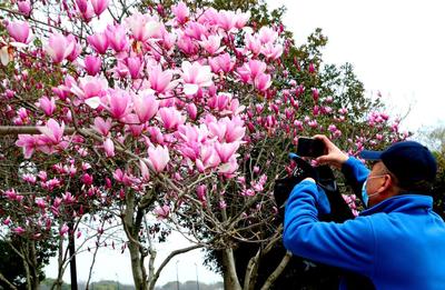 3月12日,一名市民在苏州市南门路旁玉兰花前驻足拍照。