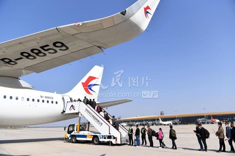 2020年3月14日,在合肥新桥国际机场,搭乘包机MU2068航班的148名劳务输出人员正在排队登机。 当日14时57分,由东航安徽分公司执行的MU2068航班顺利起飞,搭载了来自中国能源建设集团安徽电力建设第二工程有限公司148名工作人员,前往乌鲁木齐返厂复工。此次航班是东航在安徽执行的首个复工包机航班,也是安徽省首架次输出复工包机。