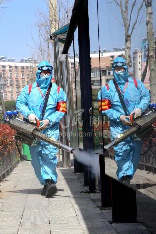 2020年3月15日,在湖北省十堰市郧阳区公交站,退役军人志愿者在喷洒消毒药剂。