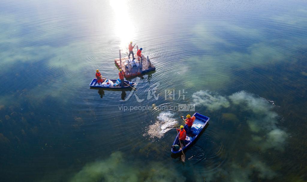 2020年3月19日,在四川省泸州市渔子溪湿地公园湖面,工作人员在对水体进行消毒。 目前,地处泸州市江阳区张坝街道的渔子溪河道防洪整治及配套工程已全面复工复产,建设单位在做好疫情防控前提下,抓进度抢工期,确保工程顺利推进。访项目采用PPP模式推进,总投资14.6亿元,建设内容包括300亩渔子溪湖体、1300亩临湖生态湿地景观、3公里疏浚整治渔子溪干流及支流河道等。预计今年6月建成投用。