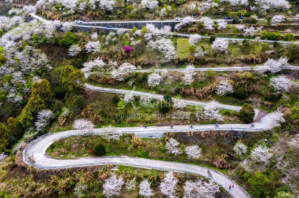 2020年3月25日,在浙江省宁波市奉化区,蜿蜒山道新浒溪线两侧,樱花盛开,云蒸霞蔚,将绿水青山渲染得分外妖娆。不少游人来到此处赏樱,在山间感受着浓郁的春意。
