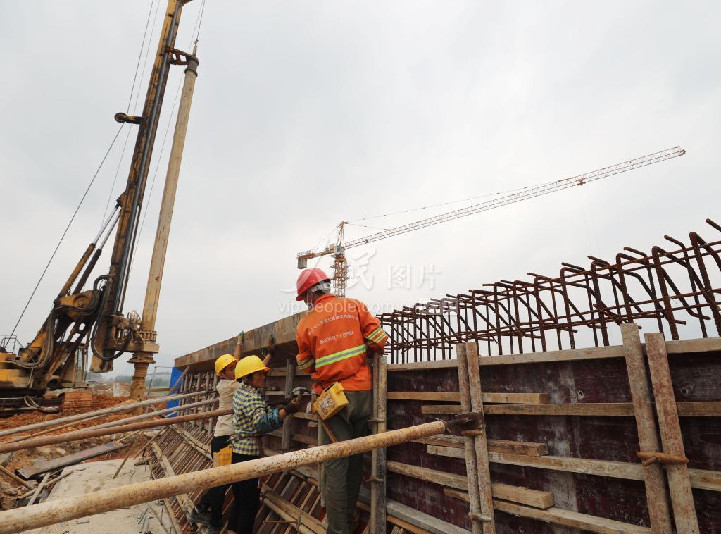 2020年3月26日,在中铁二十五局集团焦柳项目部施工现场,工人们正在对融安高铁站台进行模板加固施工。