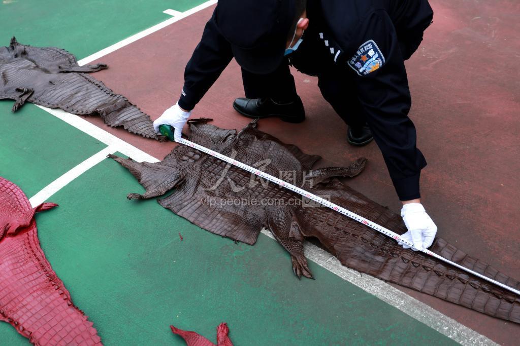 2020年3月14日,广西,民警对查获的鳄鱼及制品进行清点与核对。