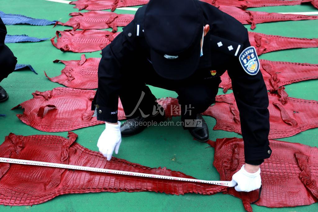 2020年3月14日,广西,民警对查获的鳄鱼及制品进行清点与核对。