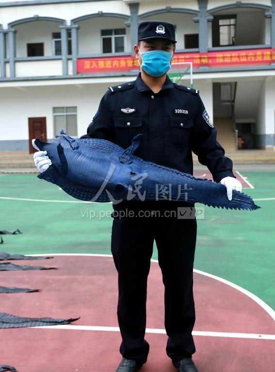 2020年3月14日,广西,民警对查获的鳄鱼及制品进行清点与核对。