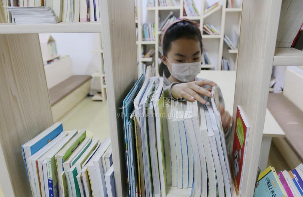 2020年3月26日,在安徽省合肥市明光路街道填海巷社区少儿图书馆,小朋友正在借阅书籍。 为满足社区儿童读书需求,近日,该社区少儿图书馆恢复开放,并采取网上预约、体温监测、扫码登记、限时限流等疫情防控措施,为小读者提供安全卫生的阅读环境,方便孩子们就近阅读学习。