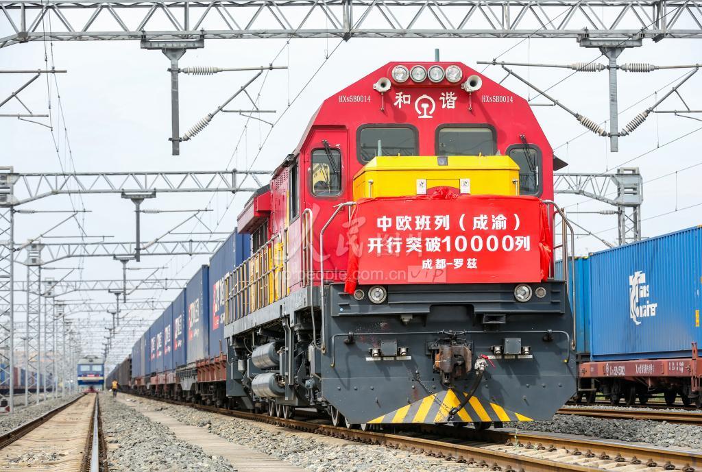 2020年3月27日上午10时30分,一列满载电子配件、机械制品的中欧班列(成渝)从成都国际铁路港出发,标志着中欧班列(成渝)开行突破10000列。 与过去不同的是,当日从成都开行的这列中欧班列不再使用“成都”标识,而是与重庆共同使用“成渝”标识,这标志着在成渝地区双城经济圈建设的背景下,作为向西开放重要陆路运输的中欧班列,开启了融合发展的进程。 成都、重庆开行的中欧班列是国内运输货值最大、辐射范围最广、产业带动最强的两大中欧班列。截至2019年底,成渝地区的中欧班列累计开行数量在全国占比超40%。