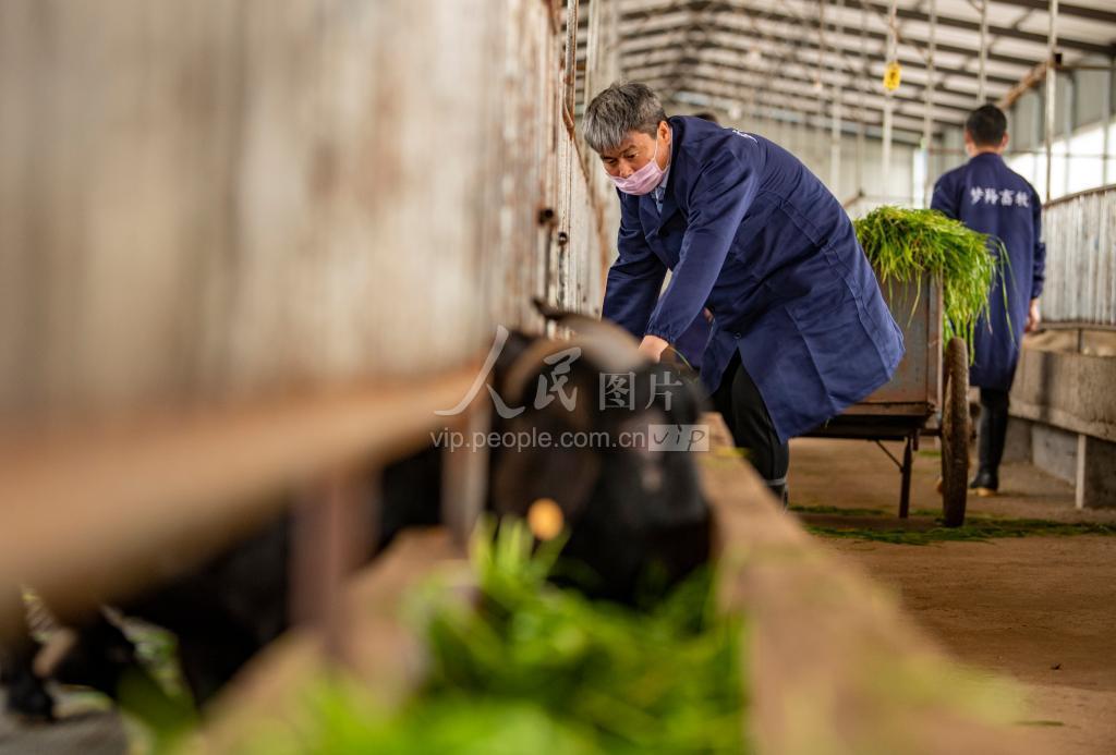 2020年3月27日,江西省新余市渝水区山羊养殖带头人张忠平和工人一起在罗坊镇绵山村养殖基地搬运草料、喂养山羊。 2014年年底,张忠平开始从事畜牧养殖。从最开始的200只羊发展到如今2000多只羊的规模,借助“公司+基地+农户+合作社”模式和现代养殖业技术,张忠平的圈养山羊基地年产值达300多万元,带动当地107户贫困户增收,他所创立的畜牧公司也成为省级农业产业化龙头企业和省级扶贫龙头企业。