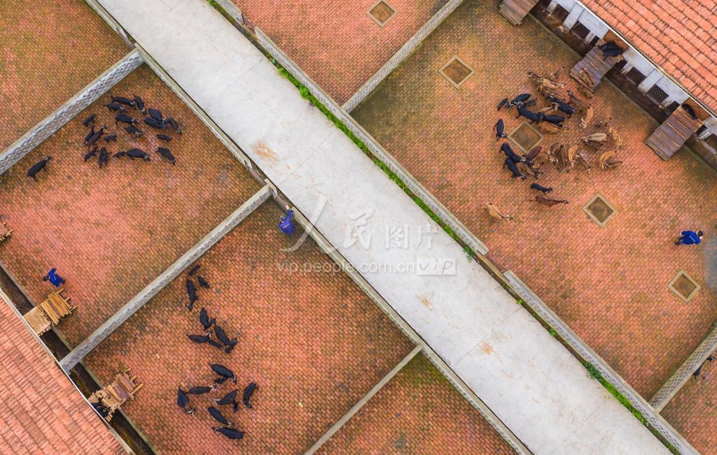 2020年3月27日,航拍下的江西省新余市渝水区罗坊镇山羊养殖基地内,工人将山羊放出运动。