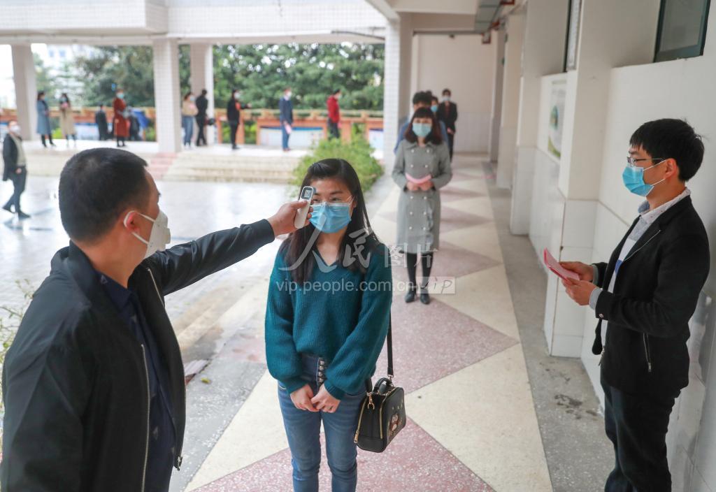 2020年3月27日,四川省华蓥中学的教师在演练进入教室前的体温检测。