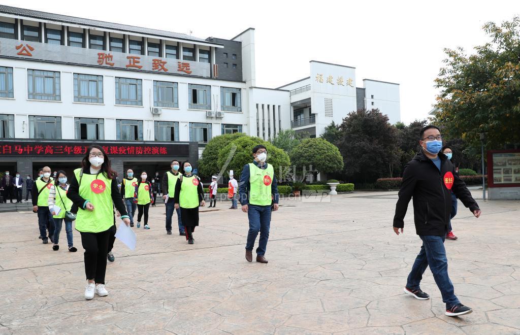 2020年3月27日,四川成都市彭州市在石室白马中学举行高三年级开学复课疫情防控演练,全市学校负责人通过现场观摩进校检测、教室上课、课间活动、食堂就餐、住校生就寝、应急处理等演练场景,为安全有序开学复课做好准备。