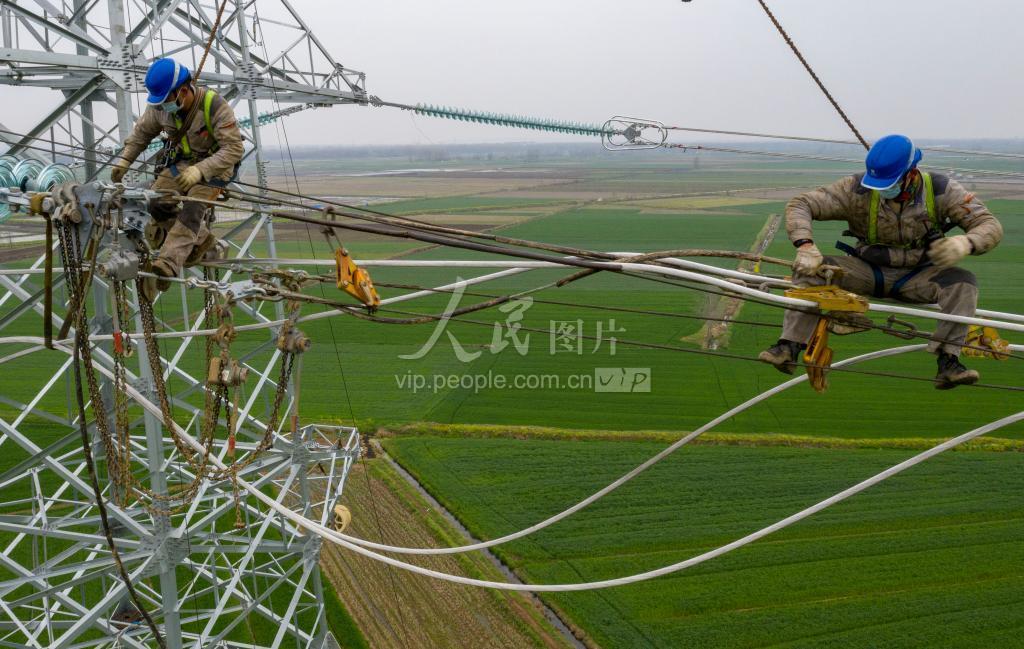 2020年3月27日,在安徽省六安市霍邱县冀台村,安徽送变电工程有限公司施工人员在50多米高空的500千伏输电铁塔上进行导线附件安装施工。