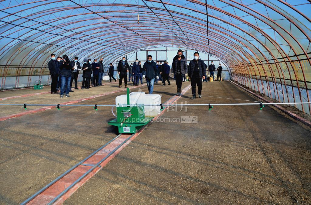 3月17日,第十管理区种植户在使用轨道喷药施肥器在时行苗床处理作业。