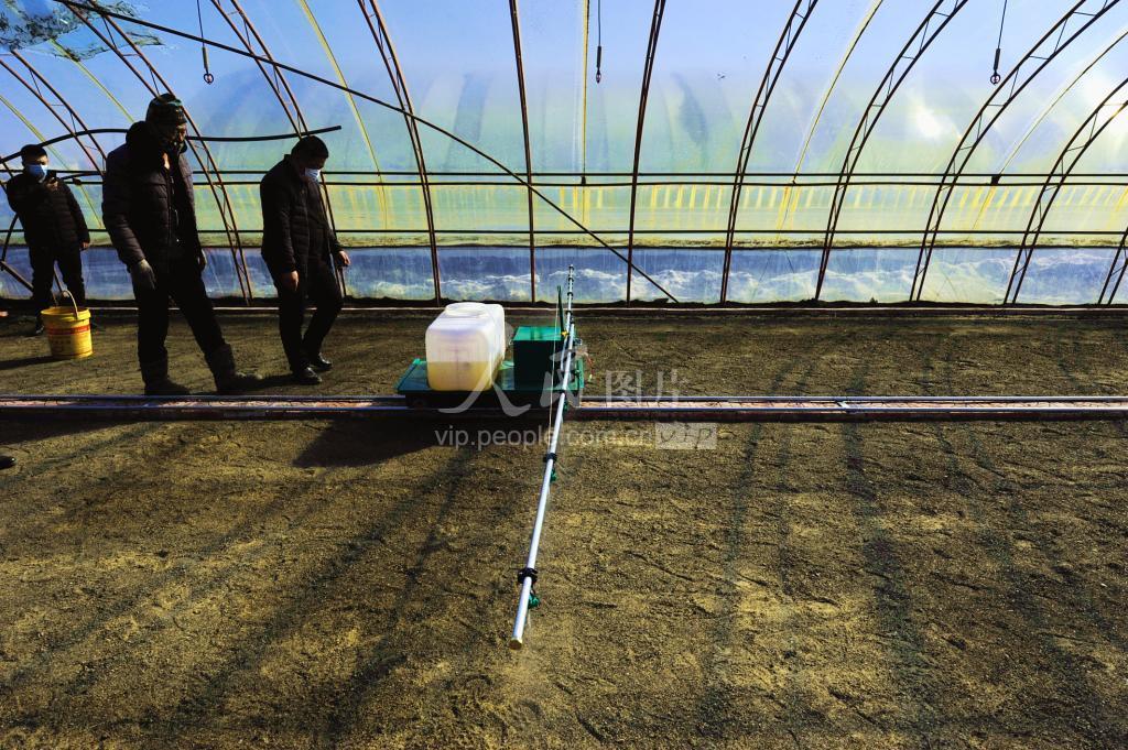 3月17日,第十管理区种植户在使用轨道喷药施肥器在时行苗床处理作业。