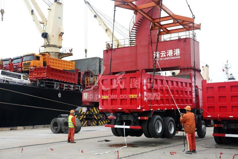 2020年3月31日,江苏连云港港集装箱码头装卸货物呈现一派繁忙景象。