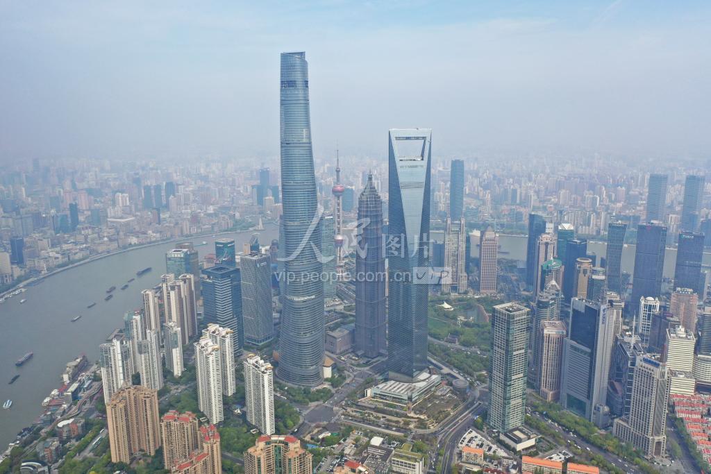 2020年4月14日,航拍浦东陆家嘴全景图,东方明珠、金茂大厦、环球金融中心、上海中心等超高层建筑高高耸立。
