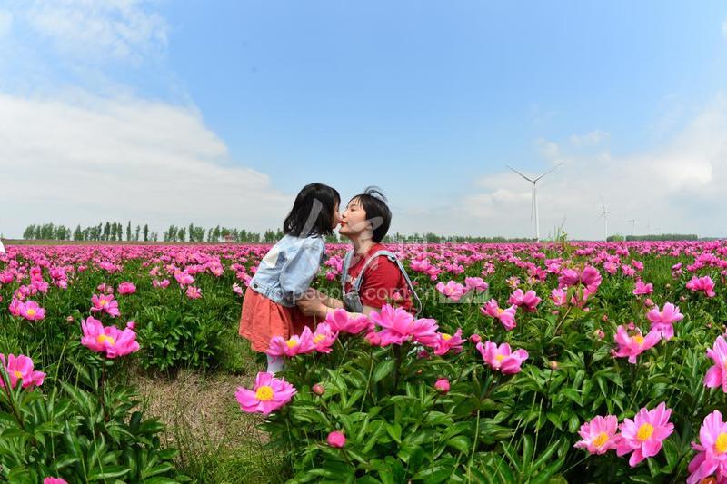2020年4月19日,江西省九江市柴桑区江洲镇益民场白芍种植基地,千亩芍药花海盛开在风车之间,前来旅游观光的游客络绎不绝,争相拍照。