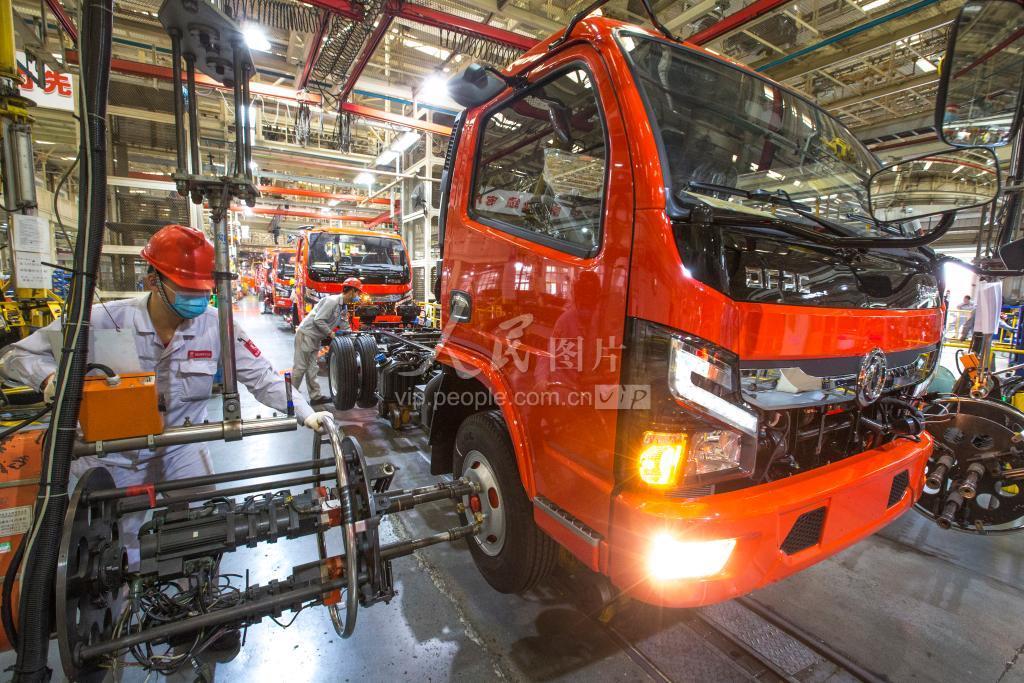 2020年4月23日,位于湖北省襄阳市的东风汽车股份轻型商用车分公司,技师在总装车间生产线上装配轻型卡车。 该公司自复工复产以来坚持防疫不松动,发展不止步,4月22日,轻卡单日生产再次刷新纪录,达到512台。截至4月18日,襄阳市规模以上工业企业复工1625 家,剔除退规保留企业影响后,复工率99.4%,员工复岗率99.6%。