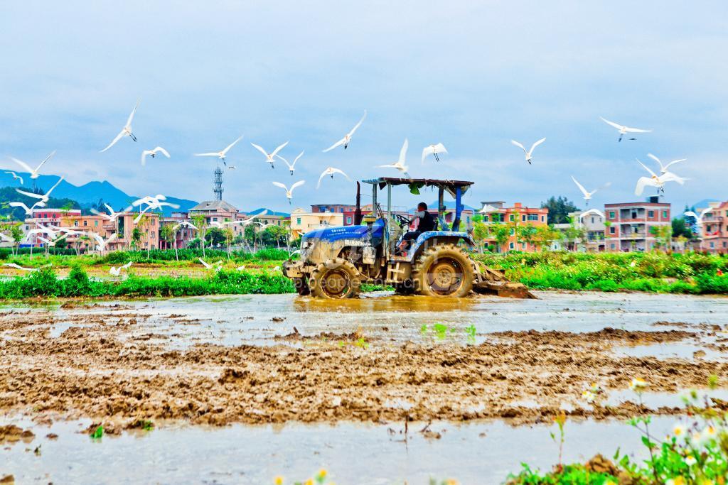 2020年4月23日,福建省泉州市惠安县辋川镇的农民朋友正在使用农机翻耕稻田,成百上千只白鹭盘旋围绕,一派现代田园劳作景象。