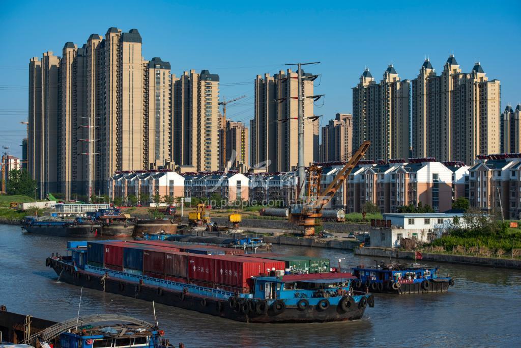 2020年4月27日,江苏省淮安市,运输船舶在京杭大运河上航行。淮安市厂矿企业绝大部分已复工复产,素有“黄金水道”美誉的京杭大运河再次迎来运输忙碌季。