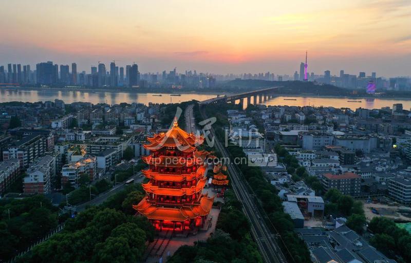 2020年4月29日,摄影师用无人机航拍了这组美轮美奂的黄鹤楼夜景图。