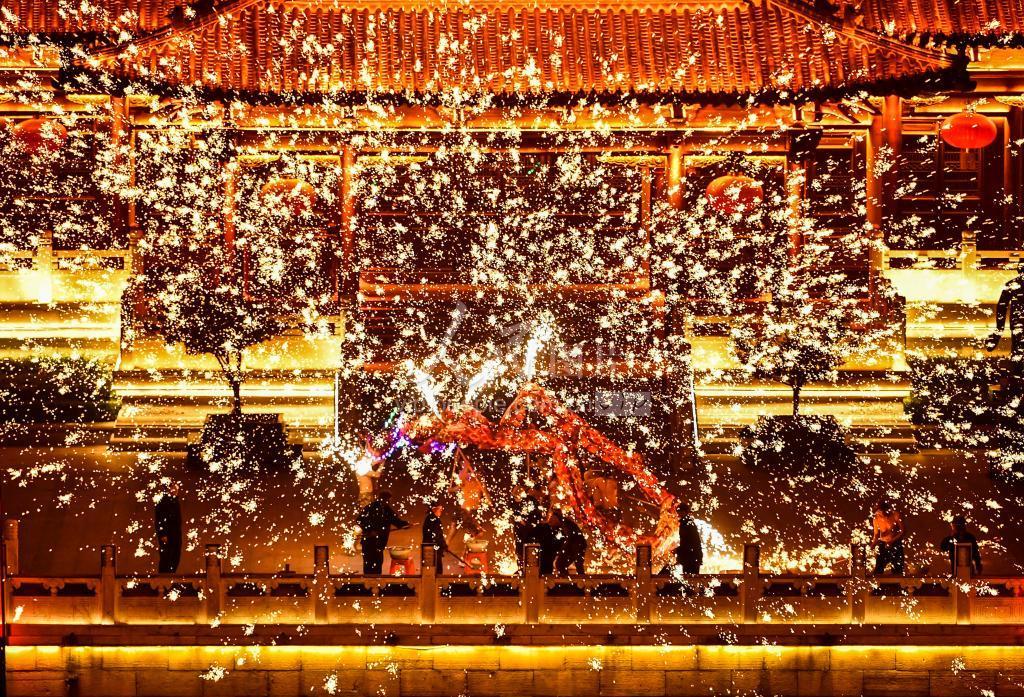 5月2日晚,民间艺人在台儿庄古城景区为游客表演非遗节目“火龙钢花”。