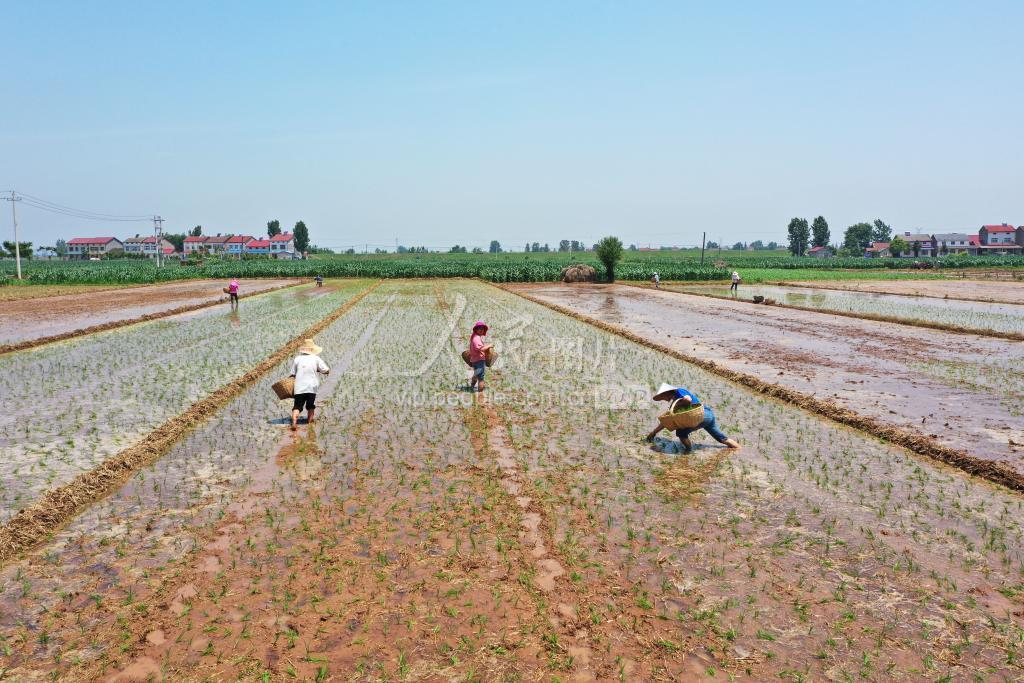 2020年5月23日湖北省当阳市两河镇双龙村6组农民正在抢战“红五月”,在平整的水田中抛秧插禾,抛秧技术不仅解决了人工插秧劳力缺失的问题还大大提升了水稻产量。