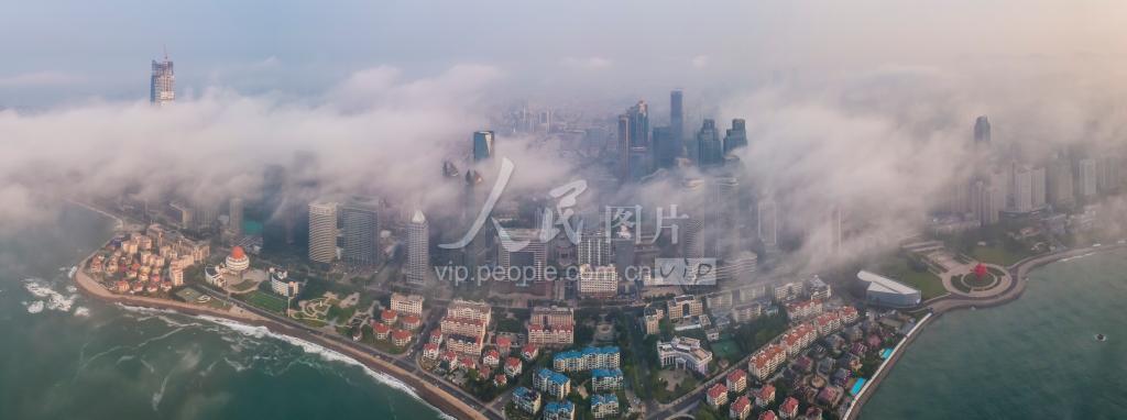 2020年5月23日清晨,青岛浮山湾沿海一带现平流雾景观,城市被一层雾气笼罩,高层建筑物“缠绕”其中,若隐若现,美景醉人。