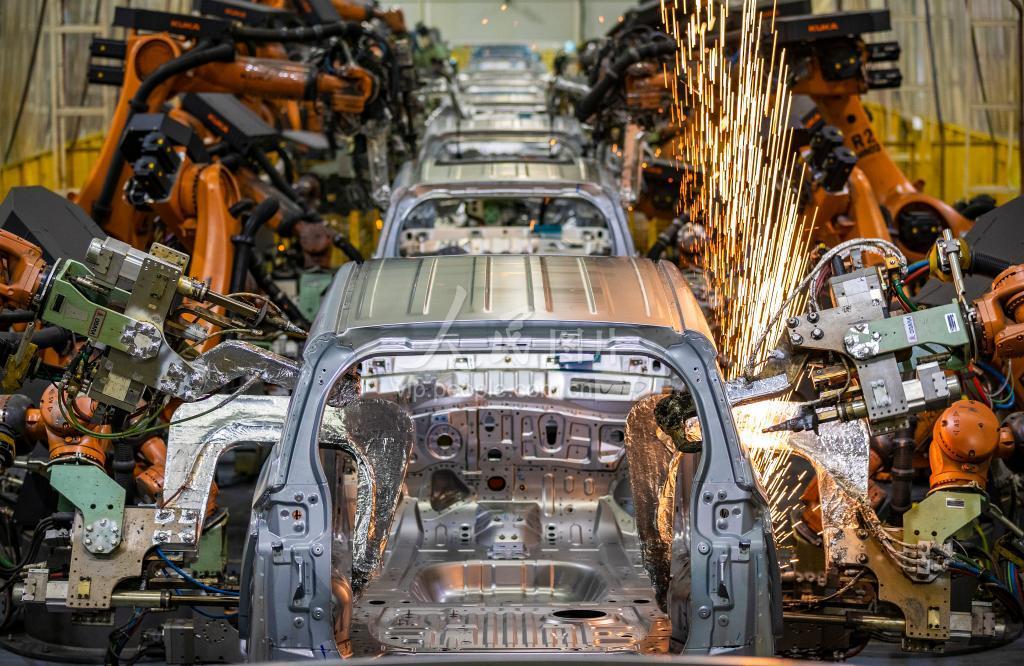 5月23日,广州市番禺区广汽传祺制造二部焊装车间,自动化焊接作业现场。
